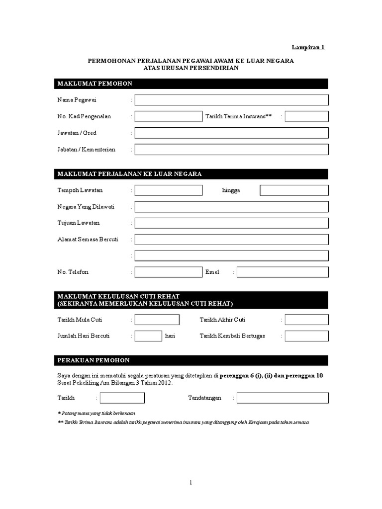 Borang Permohonan Keluar Negeri. Borang Permohonan Kemudahan Perlindungan Insurans Kesihatan Ke Luar Negara Negara. BORANG PENGISYTIHARAN PERJALANAN PEGAWAI AWAM KE LUAR NEGARA ATAS URUSAN PERSENDIRIAN MAKLUMAT PEMOHON Nama Pegawai.